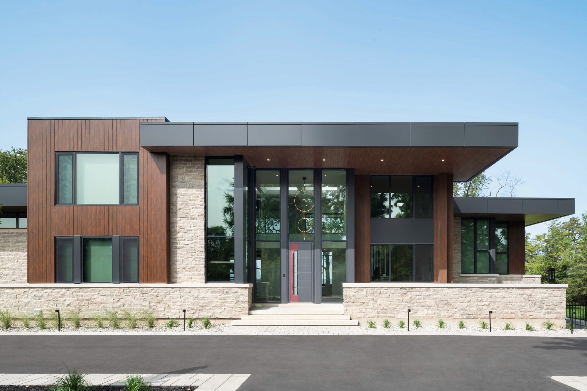 This lakefront home showcases a striking exterior finished with a blend of vertical 6-inch Luxyclad, sleek ACM panels, and rich stonework. The vertical Luxyclad boards create clean lines and a refined texture, while the ACM panels add a crisp, contemporary contrast. Natural stone grounds the design with warmth and durability, enhancing the home’s presence along the shoreline. Together, these materials form a sophisticated, long-lasting, and visually dynamic façade that complements its beautiful lakeside setting.